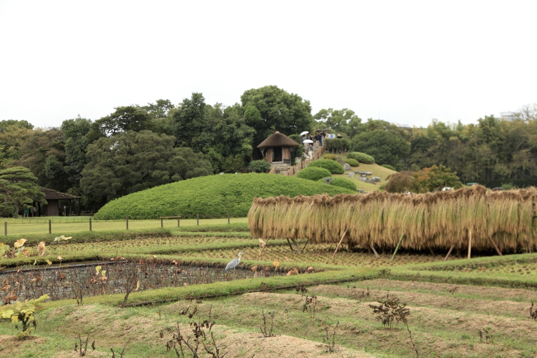 Una de las mejores perspectivas del parque se obtienen atravesando un pequeño puente que hay en la orilla del lago y subiendo la pequeña colina Yuishinzan, que fue un añadida por el hijo del daimyo para cambiar el aspecto plano de los jardines.