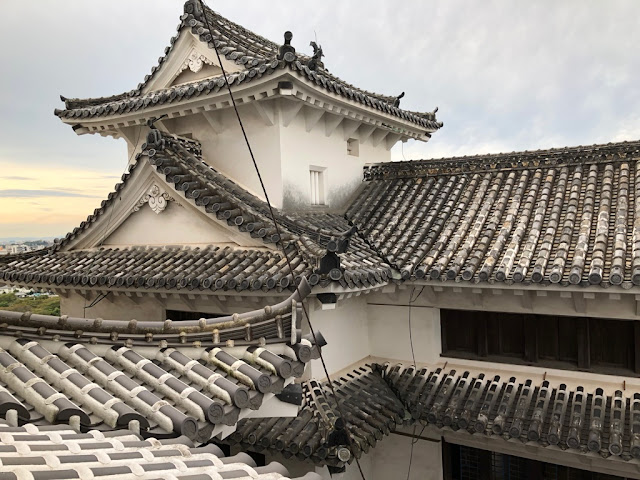 A medida que nos íbamos acercando, veíamos la imagen majestuosa del castillo, situada en lo alto de un promontorio, que domina toda la ciudad. Su arquitectura militar está suavizada por elegantes líneas estéticas y los japoneses lo llaman "el castillo de la garza blanca" por el parecido que guardan los muros encalados que se estrechan, a ambos lados de la torre, con un ave emprendiendo el vuelo.